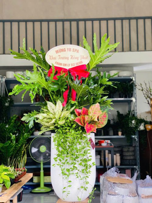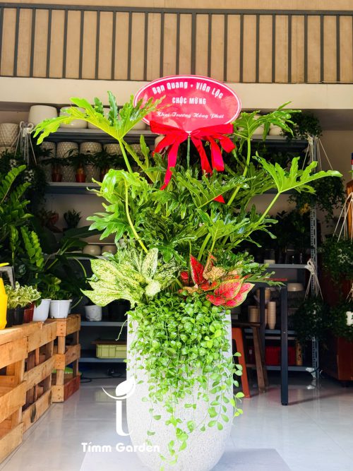 Trầu bà thanh xuân phối kết cùng lan đô la, vạn lộc, ngọc ngân tạo tổng thể hài hòa, sang trọng, Dáng cây xanh mướt, bố cục đẹp mắt – phù hợp trưng bày không gian nội thất.